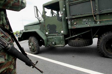 บรรยายภาพ : รถบรรทุกของทหารถูกดักระเบิดจนพังเสียหาย ซึ่งเป็นสถานการณ์ร้ายรายวันที่สามจังหวัดชายแดนภาคใต้ (ภาพโดย อับดุลเลาะ หวังหนิ)