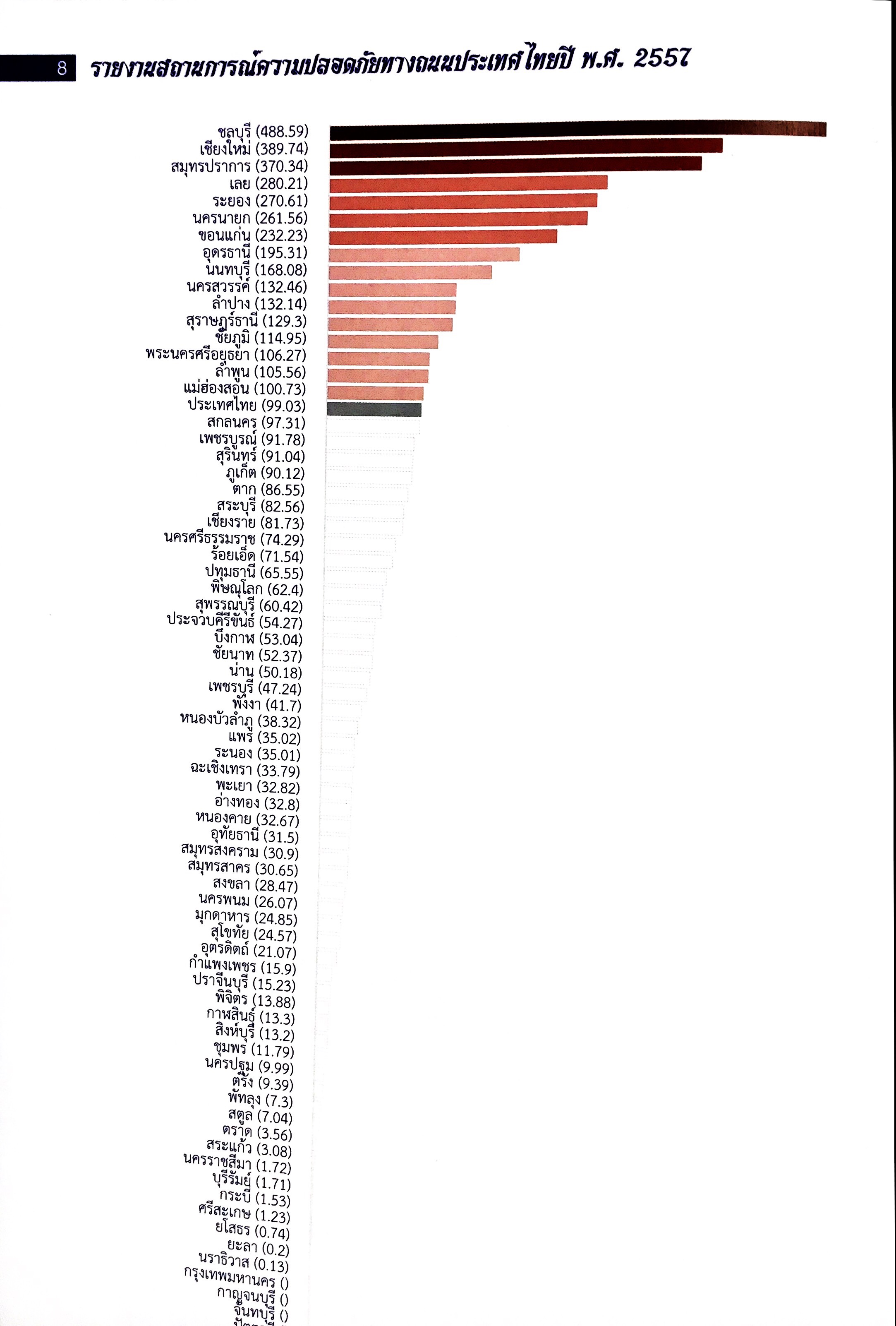 จากรายงานสถานณ์ความสูญเสียบนท้องถนนในปี 2015 ของประเทศไทย พบบว่า ยังอยู่อันดับ 2 ของโลก รองมาจากประเทศลิเบีย โดยไทยมีอัตราการตาย 36.2 ต่อประชากรแสนคน สูงกว่าอัตราตายเฉลี่ยทั่วโลก 17.5 ถึง 2 เท่า