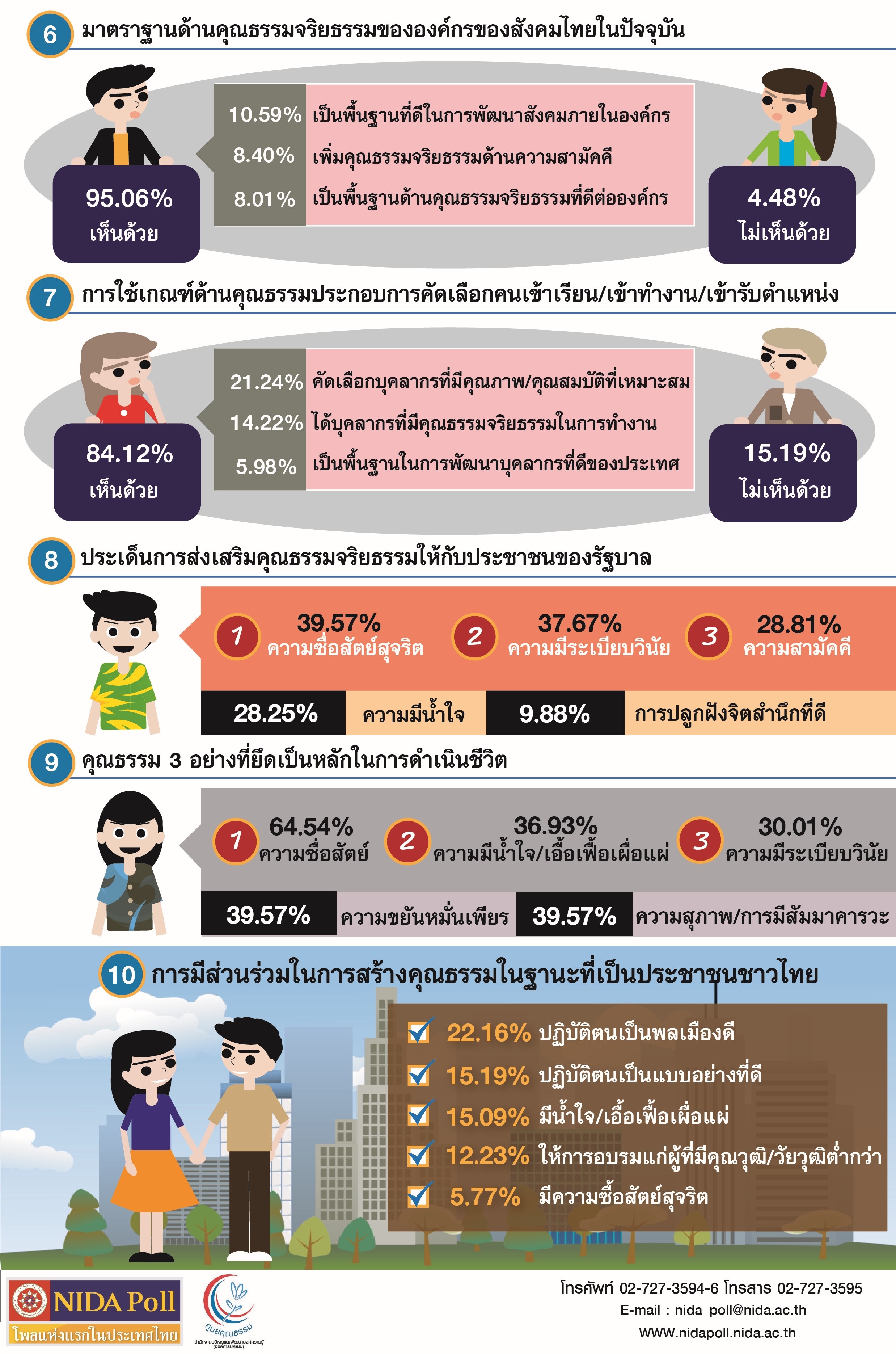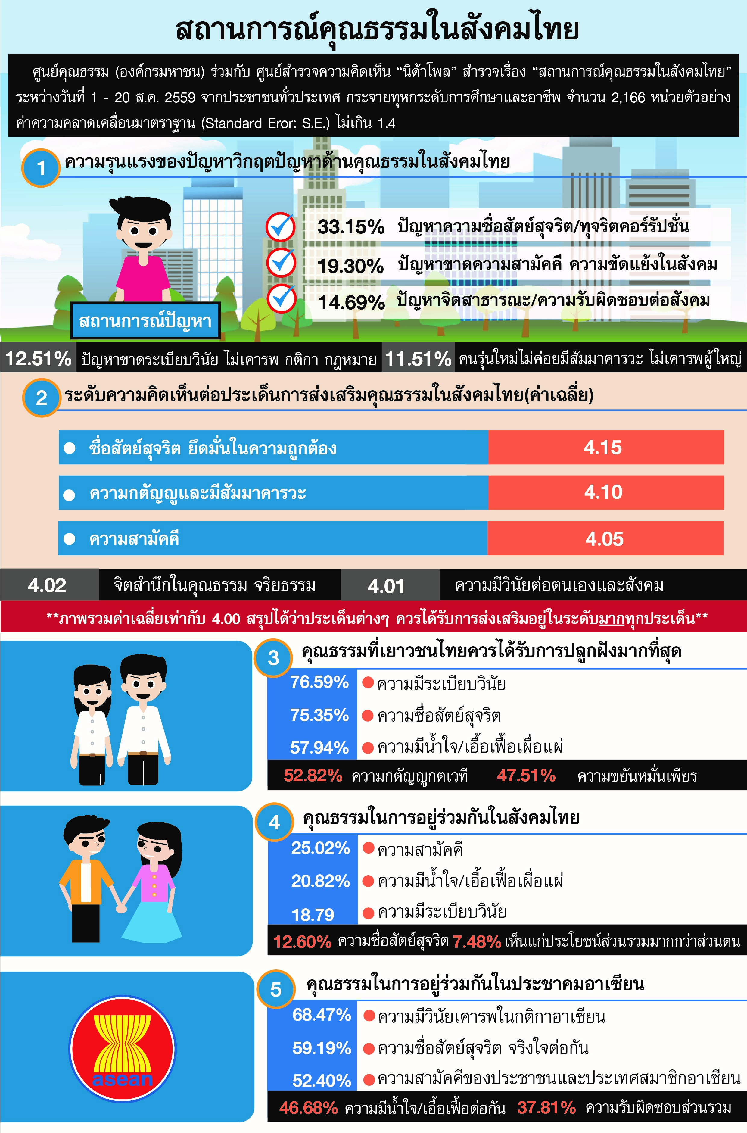 ศูนย์คุณธรรม (องค์กรมหาชน) ร่วมกับศูนย์สำรวจความคิดเห็น นิด้าโพล สำรวจเรื่อง สถานการณ์คุณธรรมในสังคมไทย ระหว่างวันที่ 1-20 สิงหาคม 2559 จากประชาชนทั่วประเทศ กระจายทุกระดับการศึกษา และอาชีพ จำนวน 2,166 หน่วยตัวอย่าง