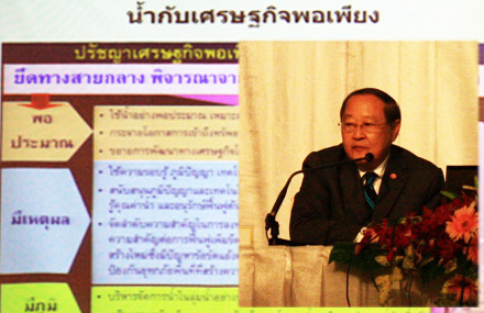 สำหรับการประยุกต์แนวทางเศรษฐกิจพอเพียงมาใช้ในการบริหารจัดการน้ำนั้น ดร.สุเมธ กล่าวว่า ต้องใช้น้ำอย่างพอประมาณ เหมาะสมกับศักยภาพน้ำที่มีอยู่ กระจายโอกาสการเข้าถึงทรัพยากรน้ำอย่างเป็นธรรม รวมทั้งขยายการพัฒนาทางเศรษฐกิจโดยคำนึงถึงข้อจำกัดของน้ำ ไม่ใช่มือใครยาวสาวได้สาวเอา อย่างเช่น สนามกอล์ฟบางแห่งที่คอยดักน้ำ หรือออกโฉนดค่อมทางน้ำ