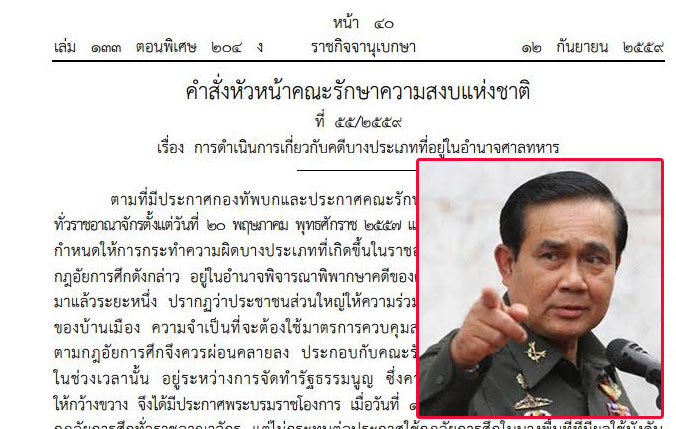 ผู้สื่อข่าวสำนักข่าวอิศรา www.isranews.org รายงานว่า เมื่อวันที่ 12 ก.ย.2559 ราชกิจจานุเบกษา ได้เผยแพร่คําสั่งหัวหน้าคณะรักษาความสงบแห่งชาติ ที่ 55/2559 เรื่อง การดําเนินการเกี่ยวกับคดีบางประเภทที่อยู่ในอํานาจศาลทหาร