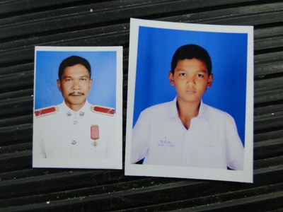 บรรยายภาพ : รูปถ่ายของ ด.ต.สถาพร คงพุทธ กับ ด.ช.พัชรพล คงพุทธ ที่ถูกคนร้ายยิงเสียชีวิตพร้อมกันทั้งพ่อลูก