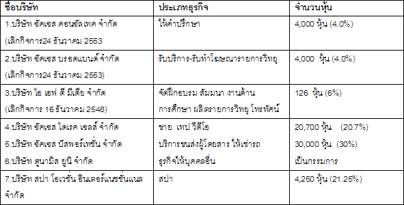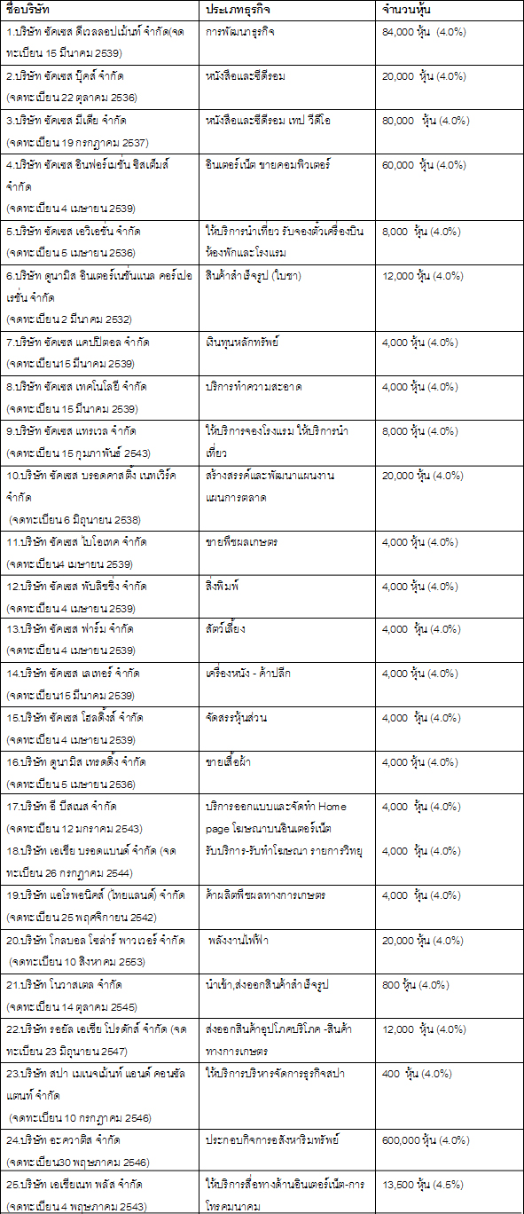 บริษัท ซัคเซส ดีเวลลอปเม้นท์ จำกัด , บริษัท ซัคเซส บุ๊คส์ จำกัด ,บริษัท ซัคเซส มีเดีย จำกัด ,บริษัท ซัคเซส อินฟอร์เมชั่น ซิสเต็มส์ จำกัด ,บริษัท ซัคเซส เอวิเอชั่น จำกัด ,บริษัท ดูนามิส อินเตอร์เนชั่นแนล คอร์เปอเรชั่น จำกัด ,บริษัท ซัคเซส แคปปิตอล จำกัด,บริษัท ซัคเซส เทคโนโลยี จำกัด ,บริษัท ซัคเซส แทรเวล จำกัด,บริษัท ซัคเซส บรอดคาสติ้ง เนทเวิร์ค จำกัด,บริษัท ซัคเซส ไบโอเทค จำกัด, บริษัท ซัคเซส พับลิชชิ่ง จำกัด ,บริษัท ซัคเซส ฟาร์ม จำกัด,บริษัท ซัคเซส เลเทอร์ จำกัด, บริษัท ซัคเซส โฮลดิ้งส์ จำกัด,บริษัท ดูนามิส เทรดดิ้ง จำกัด, บริษัท อี บีสเนส จำกัด ,บริษัท เอเชีย บรอดแบนด์ จำกัด ,บริษัท แอโรพอนิคส์ (ไทยแลนด์) จำกัด