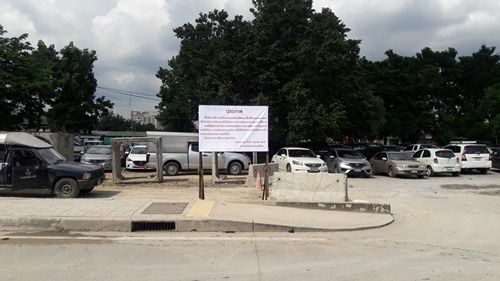 ป้ายประกาศ ระบุ พื้นที่บริเวณนี้ การรถไฟแห่งประเทศไทยได้ส่งมอบพื้นที่ให้กรุงเทพมหานครเพื่อดำเนินการปรับปรุงแก้ไขปัญหาการจราจรโดยรอบโรงพยาบาลศิริราช ขณะนี้อยู่ระหว่างดำเนินการของหน่วยบัญชาการทหารพัฒนา กองบัญชาการกองทัพไหทย การรถไฟแห่งประเทศไทย มิได้ให้สิทธิการเช่า หรือสิทธิเรียกเก็บค่าจอดรถแก่เอกชนรายได้ทั้งสิ้น จึงประกาศมาเพื่อทราบโดยทั่วกัน