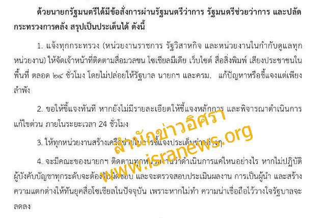 ผู้สื่อข่าวสำนักข่าวอิศรา www.isranews.org รายงานว่า เมื่อวันที่ 7 ต.ค.2559 ที่ผ่านมา กลุ่มผู้บริหารหน่วยงานราชการหลายแห่ง ได้มีการส่งแชร์ต่อข้อมูลคำสั่งการของ พล.อ.ประยุทธ์ จันทร์โอชา นายกรัฐมนตรี และหัวหน้าคณะรักษาความสงบแห่งชาติ(คสช.) ในการแจ้งทุกกระทรวง หน่วยงานราชการ รัฐวิสาหกิจและหน่วยงานในกำกับดูแลทุกหน่วยงาน ให้จัดเจ้าหน้าที่ติดตามสื่อประเภทต่างๆ ตลอด 24 ชั่วโมง โดยไม่ปล่อยให้รัฐบาล นายกฯ และครม. แก้ปัญหาหรือชี้แจงต่อเพียงลำพัง ซึ่งในการดำเนินการเรื่องนี้จะมีคณะของนายกฯ ติดตามการดำเนินงานของทุกหน่วยงาน ว่าดำเนินการแค่ไหน หากไม่ปฏิบัติตามผู้บังคับบัญชาทุกระดับจะต้องรับผิดชอบ และจะตรวจสอบประเมินผลงานการเป็นผู้นำ และสร้างความแตกต่างให้ทันยุคสื่อโซเซียลในปัจจุบัน เพราะหากไม่ทำความน่าเชื่อถือไว้วางใจรัฐบาลจะลดลง