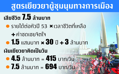 3 กราฟฟิกแสดงสูตรคำนวณเงินเยียวยาที่เตรียมมอบให้กับญาติผู้เสียชีวิตจากการชุมนุมทางการเมือง