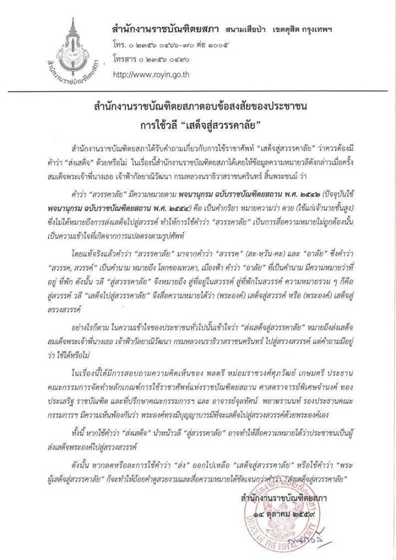 ผ่านไปสองวัน ทางสำนักงานราชบัณฑิตยสภาประกาศตัวอย่างการใช้ถ้อยคำเพื่อแสดงความอาลัยถวายแด่พระบาทสมเด็จพระปรมินทรมหาภูมิพลอดุลยเดช ตัดวลี "ด้วยเกล้าด้วยกระหม่อม ขอเดชะ" ออกไป