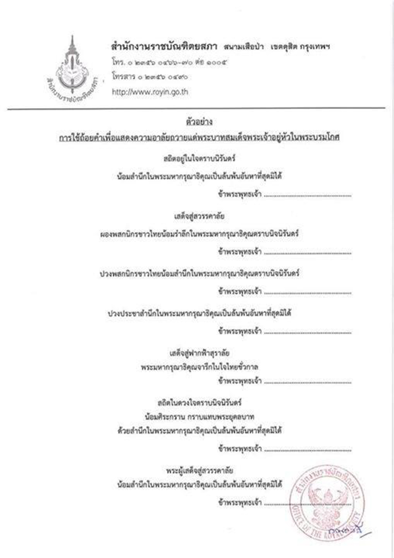 ตัวอย่างที่ให้ไว้ไม่ได้บังคับใช้ ให้องค์กรหน่วยงานเลือกใช้ตามความเหมาะสม อาจปรับเปลี่ยนได้บ้าง เพราะที่จริง สำนวนที่ให้ไว้เป็นตัวอย่าง บางสำนวนก็เหมือน "ลิเกหลงโรง" ตัดคำขยาย เช่น ตราบนิจนิรันดร์ เป็นล้นพ้นอันหาที่สุดมิได้ (วลีนี้เลือกใช้ "เป็นล้นพ้น" หรือใช้ "อันหาที่สุดมิได้" ท่อนใดท่อนหนึ่งก็น่าจะพอ อันนี้เป็นเรื่องรสนิยมทางภาษา คนไม่ชอบความเยิ่นเย้อเว่อร์วังก็ว่าควรตัด คนชอบภาษาตุ้งติ้งตกแต่งมากๆ ก็ว่าใช้ซ้อนกันดีแล้ว)