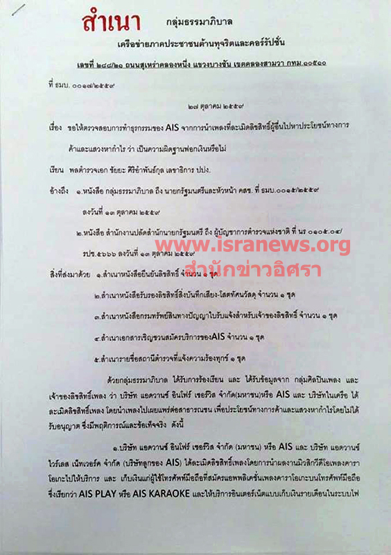 สืบเนื่องจาก กลุ่มธรรมาภิบาล เครือข่ายภาคประชาชนต้านทุจริตและคอร์รัปชัน พร้อมผู้เสียหาย ได้เดินทางเข้ายื่นหนังสือถึง พล.อ.ประยุทธ์ จันทร์โอชา นายกรัฐมนตรี และหัวหน้า คสช. ที่ศูนย์บริการประชาชน ทำเนียบรัฐบาล เพื่อขอให้ช่วยเหลือกลุ่มศิลปิน และเจ้าของลิขสิทธิ์เพลงต่าง ๆ กรณี บริษัท แอดวานซ์ อินโฟร์ เซอร์วิส จำกัด (มหาชน) หรือ AIS นำผลงานเพลงที่มีลิขสิทธิ์ไปเผยแพร่ต่อสาธารณชนโดยไม่ได้รับอนุญาต เพื่อประโยชน์ทางการค้าและแสวงหาผลกำไร รวมถึง ขอให้ตรวจสอบเจ้าหน้าที่ตำรวจที่ได้เข้าแจ้งความร้องทุกข์ในกรณีนี้ไว้แล้วทั้ง 21 สถานี ว่า ได้ละเว้นการปฏิบัติหน้าที่หรือปฏิบัติหน้าที่โดยมิชอบหรือไม่ เหตุเพราะในทางคดีไม่มีความคืบหน้า แต่อย่างใด (อ่านประกอบ : ยื่น'บิ๊กตู่'สอบ‘AIS’ แพร่เพลงมีลิขสิทธิ์ผ่านแอพฯ-เอกชนดัง ยันไม่ละเมิด)