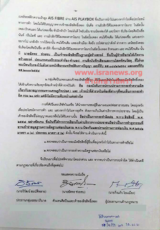 ปธ.กลุ่มธรรมาภิบาลฯ พร้อม ‘อัตพร ช่วยซบ’ เจ้าของลิขสิทธิ์เพลง เข้ายื่นหนังสือถึง ‘พล.ต.อ.ชัยยะ ศิริอัมพันธ์กุล-เลขาฯ ปปง.’ ให้ตรวจสอบ AIS เข้าข่ายความผิดฐานฟอกเงินหรือไม่ กรณีนำเพลงมีลิขสิทธิ์เผยแพร่โดยไม่ได้รับอนุญาต เพื่อประโยชน์ทางการค้า หลังเอกชนดังยันได้รับสิทธิ์จาก ผู้รวบรวมคอนเทนต์เพลง ทำสัญญาถูกต้อง