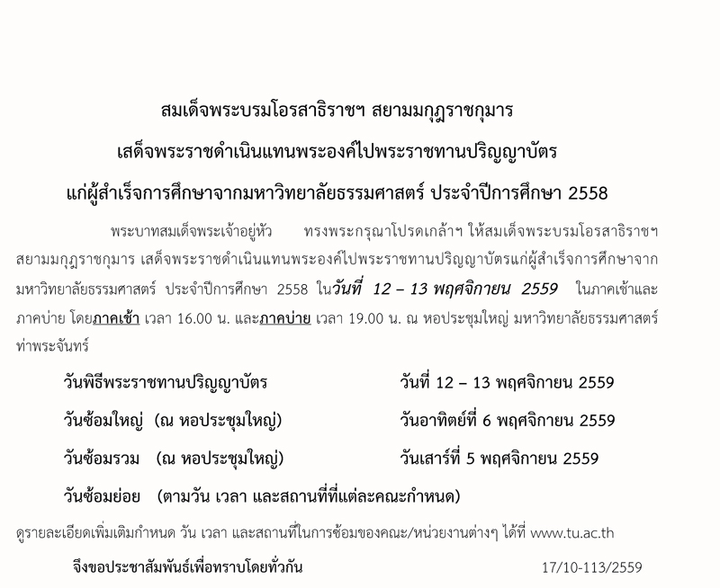 ผู้สื่อข่าวรายงานว่า สมเด็จพระบรมโอรสาธิราชฯ สยามมกุฎราชกุมารเสด็จพระราชดำเนินไปพระราชทานปริญญาบัตรแก่ผู้สำเร็จการศึกษาจากมหาวิทยาลัยธรรมศาสตร์ ประจำปีการศึกษา 2558 ในวันที่ 12 – 13 พฤศจิกายน 2559 ในภาคเช้าและภาคบ่าย โดยภาคเช้า เวลา 16.00 น. และภาคบ่าย เวลา 19.00 น. ณ หอประชุมใหญ่ มหาวิทยาลัยธรรมศาสตร์ ท่าพระจันทร์
