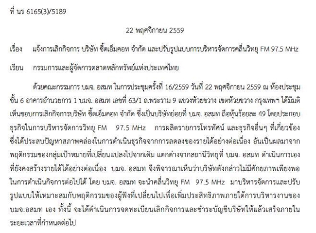 เล่นเอาบรรดาแฟนคลับ 'คลื่นซี้ด' เกิดอาการช็อกไปตามๆ กัน เมื่อ บริษัท อสมท จำกัด (มหาชน) หรือ MCOT ออกประกาศแจ้งยกเลิกกิจการ บริษัท ซี้ดเอ็มคอท จำกัด ที่บริหารคลื่นวิทยุ FM 97.5 MHz โดยระบุว่า ประสบปัญหาสภาพคล่องในการดำเนินธุรกิจจากการลดลงของรายได้ต่อเนื่อง เป็นผลจากพฤติกรรมของกลุ่มเป้าหมายที่เปลี่ยนไปจากเดิม แตกต่างจากสถานีวิทยุที่ บมจ.อสมท ดำเนินการเองที่ยังสร้างรายได้อย่างต่อเนื่อง จึงพิจารณาเห็นว่าบริษัทดังกล่าวไม่มีศักยภาพเพียงพอในการดำเนินกิจการต่อไปได้ และจะนำคลื่นวิทยุ FM 97.5 MHz มาบริหารเอง (อ้างอิงข้อมูลข่าวส่วนนี้จาก MGR Online)