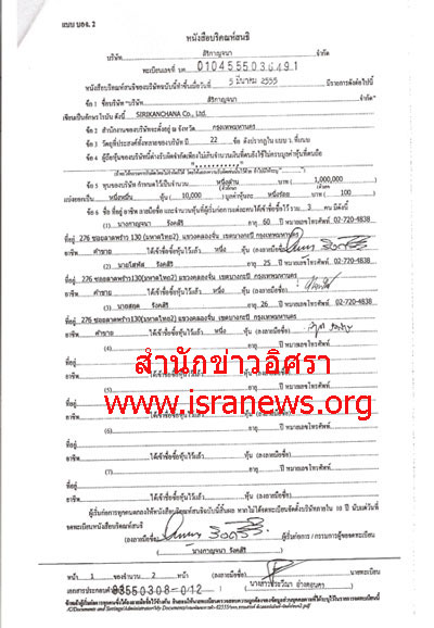 ปี 2555 แจ้งว่า มีเงินสด 21,363 บาท มีที่ดิน อาคารและอุปกรณ์ 4,822,477 บาท รวมสินทรัพย์ 4,843,840 บาท หนี้สิน แจ้งว่า มีเจ้าหนี้อื่นๆ 5,000 บาท เงินกู้ยืมระยะสั้น 3,850,000 บาท รวมหนี้สิน 3,855,000 บาท
