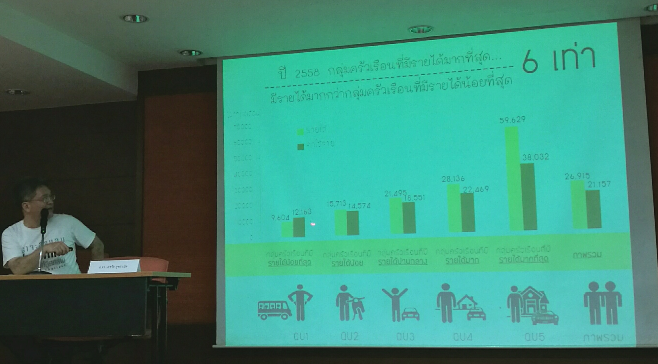 ขณะที่ดร. เดชรัต สุขกำเนิด คณะเศรษฐศาสตร์ มหาวิทยาลัยเกษตรศาสตร์ กล่าวถึงสถานการณ์ทางเศรษฐกิจของครัวเรือรากฐานของประเทศไทย แบ่งกลุ่มครัวเรือนเป็น 5 กลุ่ม โดยเรียงลำดับรายได้ จากกลุ่มที่จนที่สุด 20% แรก ไปจนถึงกลุ่มที่รวยที่สุด 20% สุดท้าย