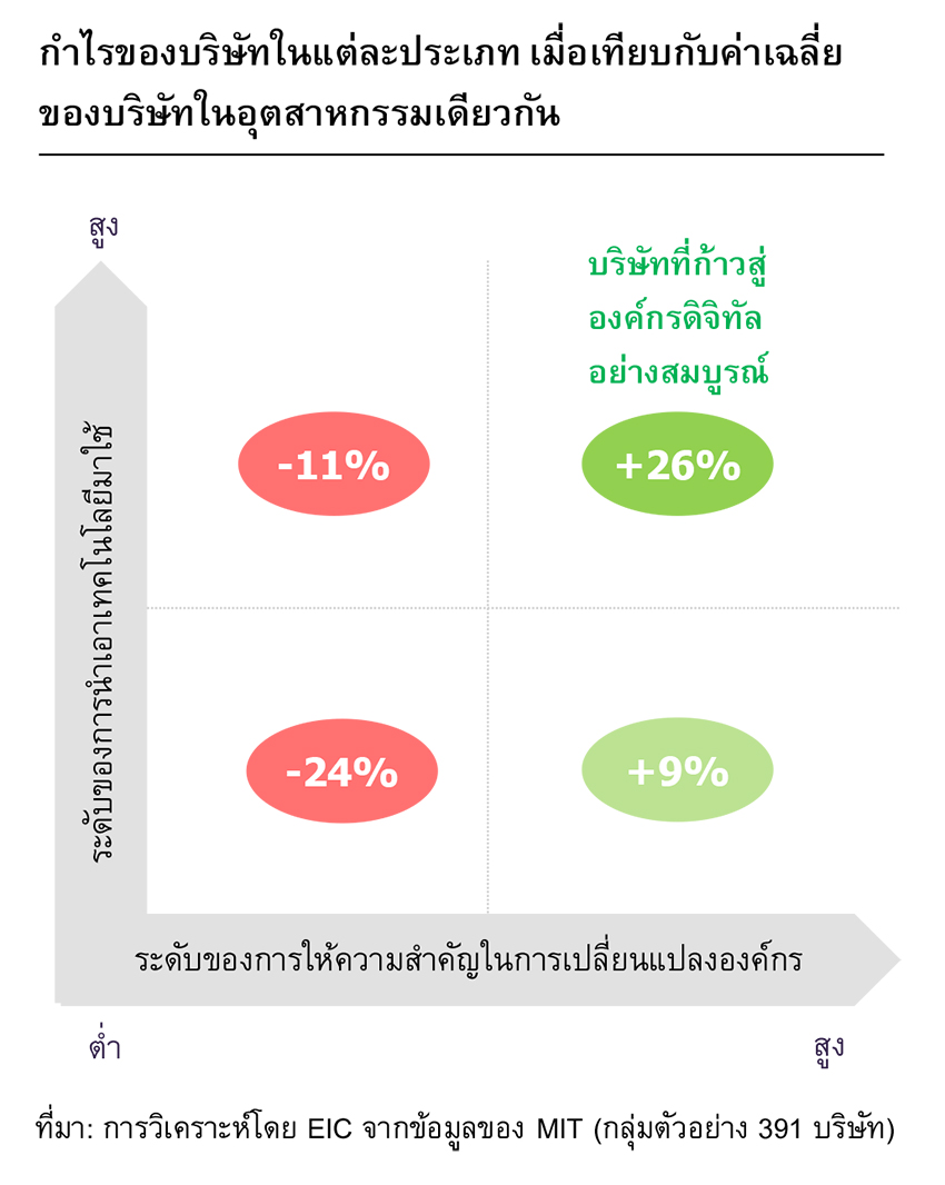 ทั้งนี้ หากผู้ประกอบการแบบดั้งเดิมสามารถยกระดับตนเองสู่องค์กรดิจิทัลได้ แน่นอนว่าจะช่วยให้องค์กรสามารถลดต้นทุนจากภาระงานที่ไม่จำเป็น และทำให้ประสิทธิภาพและผลผลิตในการทำงานดีขึ้น ซึ่งสุดท้ายแล้วจะช่วยเพิ่มผลกำไรให้แก่องค์กรได้อีกทาง โดยจากการศึกษาของมหาวิทยาลัย MIT พบว่าบริษัทที่นำเทคโนโลยีมาประยุกต์ใช้ได้อย่างสำเร็จจะมีผลกำไรที่เหนือกว่าบริษัทอื่นๆ ในอุตสาหกรรมเดียวกันถึง 26% ซึ่งผลตอบแทนดังกล่าวนับว่ามีความคุ้มค่าในระยะยาว เมื่อเทียบกับเม็ดเงินลงทุนด้าน ICT ที่โดยเฉลี่ยจะอยู่เพียงราว 3-5% ของรายได้ทั้งปีเท่านั้น