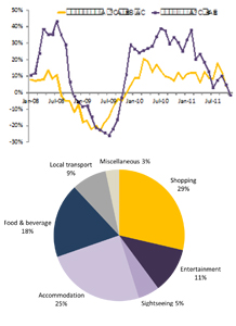 นักท่องเที่ยวจากเอเชียยังมีแนวโน้มขยายตัวจะผลักดันให้ธุรกิจค้าปลีกเติบโตดี โดยจำนวนนักท่องเที่ยวจาก เอเชียซึ่งมีสัดส่วนราว 40% ของนักท่องเที่ยวทั้งหมดยังมีแนวโน้มเติบโตต่อเนื่อง โดยเฉพาะนักท่องเที่ยวจากจีนและฮ่องกงซึ่งมีสัดส่วนราว 10% ของนักท่องเที่ยวทั้งหมดเดินทางเข้ามาท่องเที่ยวในไทยเพิ่มขึ้นมากกว่า 50% ในปี 2011 และคาดว่าในปี 2012 ยังมีแนวโน้มเติบโตดีต่อเนื่องซึ่งจะผลักดันให้ธุรกิจค้าปลีกขยายตัวดีเนื่องจากนักท่องเที่ยวจีนและฮ่องกงมีการจับจ่ายใช้สอยเพิ่มขึ้น โดยยอดการใช้จ่ายโดยเฉลี่ยต่อหัวอยู่ที่ประมาณ 146 ดอลลาร์สหรัฐต่อคนต่อวันซึ่งมากกว่าค่าเฉลี่ยของการใช้จ่ายของนักท่องเที่ยวโดยรวมที่อยู่ที่ประมาณ 130 ดอลลาร์สหรัฐต่อคนต่อวัน ทั้งนี้ เป็นที่สังเกตว่าสัดส่วนการใช้จ่ายด้านการ shopping ของนักท่องเที่ยวกลุ่มนี้สูงถึงราว 30% ของการใช้จ่ายทั้งหมดและยังสูงกว่าค่าใช้จ่ายในด้านที่พักอีกด้วย