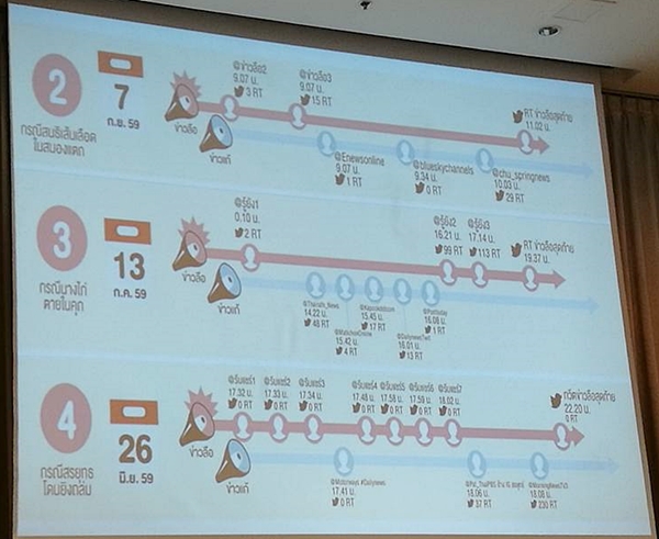 “กรณีข่าวลือนางไก่ตายในคุก ที่สืบค้นเจอ ต้นตอมาจากเฟชบุคแฟนเพจ หรือกรณีข่าวลือสนธิเส้นเลือดในสมองแตก ก็มาจากทีวีข่าว เป็นรายการเล่าข่าว หรือกรณีข่าวลือในหลวงรัชกาลที่ 9 เสด็จสวรรคต ก็มาจาก Intertional News อ้าง ซึ่งแหล่งข่าวของข่าวลือไหลข้ามสื่อกัน”