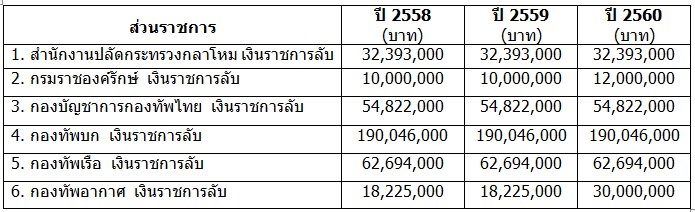 สำหรับกระทรวงกลาโหมเงินราชการลับจะตั้งในส่วนราชการในสังกัดปรากฏในเอกสารประกอบงบประมาณรายจ่าย ฉบับ 3 เล่ม 1 งบประมาณรายจ่ายประจำปีงบประมาณ 2558,/2559 และ 2560 ดังนี้