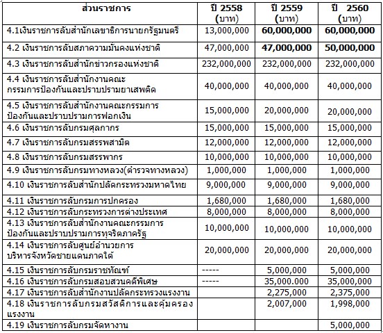 ดังตัวอย่างในเอกสารประกอบร่างพระราชบัญญัติงบประมาณรายจ่ายประจำปีงบประมาณ พ.ศ.2556 และ 2557 ของรัฐบาลนางสาว ยิ่งลักษณ์ ชินวัตร ฉบับที่ 3 เล่มที่ 1 และ ในเอกสารประกอบร่างพระราชบัญญัติงบประมาณรายจ่ายประจำปีงบประมาณ พ.ศ. 2558 ของรัฐบาลพลเอก ประยุทธ์ จันทร์โอชา จะอยู่ในฉบับที่ 3 เล่มที่ 1 เช่นกัน (รายการเงินราชการ “ลับ” จะมีการตั้งไว้เหมือนกันแบบนี้ทุกๆ ปีงบประมาณซึ่งสามารถหาข้อมูลย้อนหลังไปได้นับตั้งแต่มีระบบเงินราชการลับเกิดขึ้น) ดังนี้