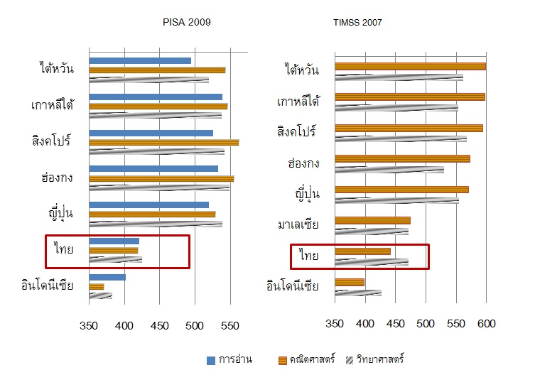 แม้งบการศึกษาที่เพิ่มขึ้นอาจช่วยให้เด็กวัยเรียนจากครอบครัวยากจนเข้าถึงการศึกษามากขึ้นในเชิงปริมาณก็ตาม ผลการเรียนของนักเรียนซึ่งเป็นตัวชี้วัดสำคัญของคุณภาพการศึกษาโดยรวมกลับตกต่ำ ดังจะเห็นได้จากผลคะแนนสอบนักเรียนไทยไม่ว่าจะวัดจากข้อสอบมาตรฐานในประเทศอย่าง O-NET หรือระหว่างประเทศอย่าง PISA และ TIMSS มีแนวน้มลดลงและต่ำกว่าประเทศเพื่อนบ้านยกเว้นอินโดนีเซีย (ภาพที่ 3) ในขณะเดียวกัน ก็ปรากฏข่าวนักเรียนไทยจากโรงเรียนมีชื่อเสียงในกรุงเทพฯ สามารถสอบแข่งขันได้เหรียญรางวัลระดับโลกต่างๆ อยู่ทุกปี ซึ่งแสดงให้เห็นถึงความเหลื่อมล้ำระหว่างโรงเรียนในพื้นที่ต่างๆ และชี้ว่าการพัฒนาคุณภาพของโรงเรียนไทยที่ผ่านมาเป็นไปอย่างไม่ทั่วถึง