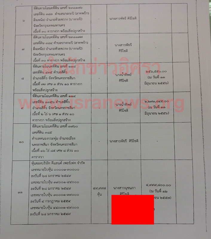 6.ที่ดินโฉนดเลขที่ 231176 เลขที่ 383 บางกะปิ เขตห้วยขวาง กรุงเทพฯ เนื้อที่ 30 ตารางวา พร้อมสิ่งปลูกสร้าง ผู้ถือกรรมสิทธิ/ครอบครอง น.ส.พัชรี ศิริโชติ
