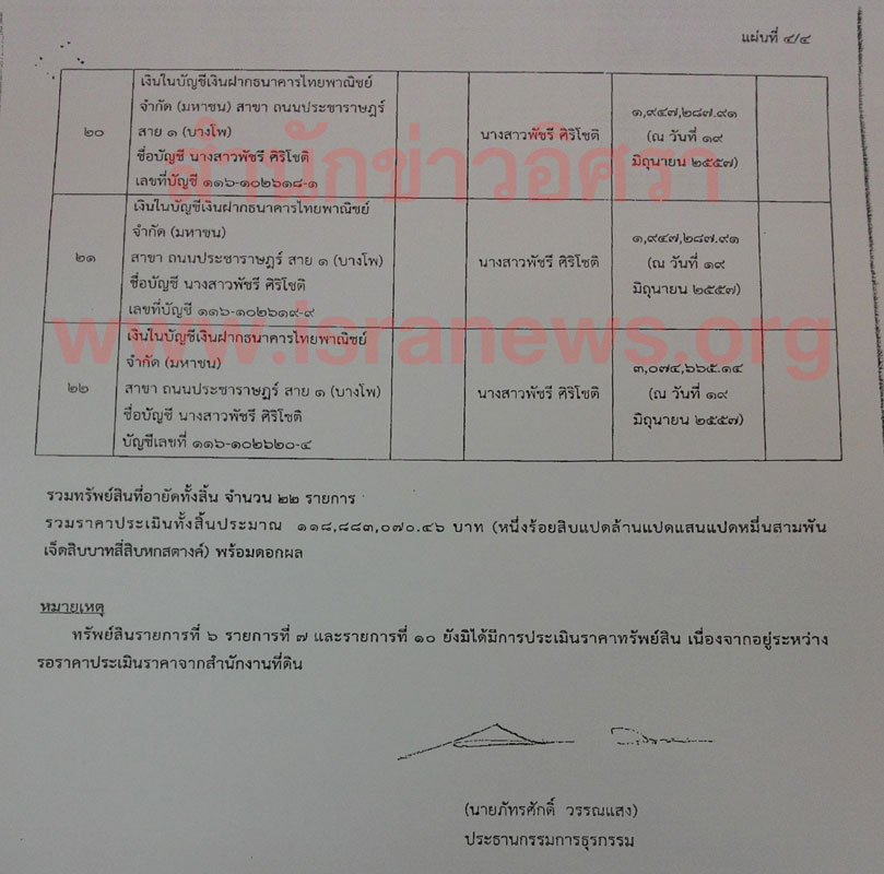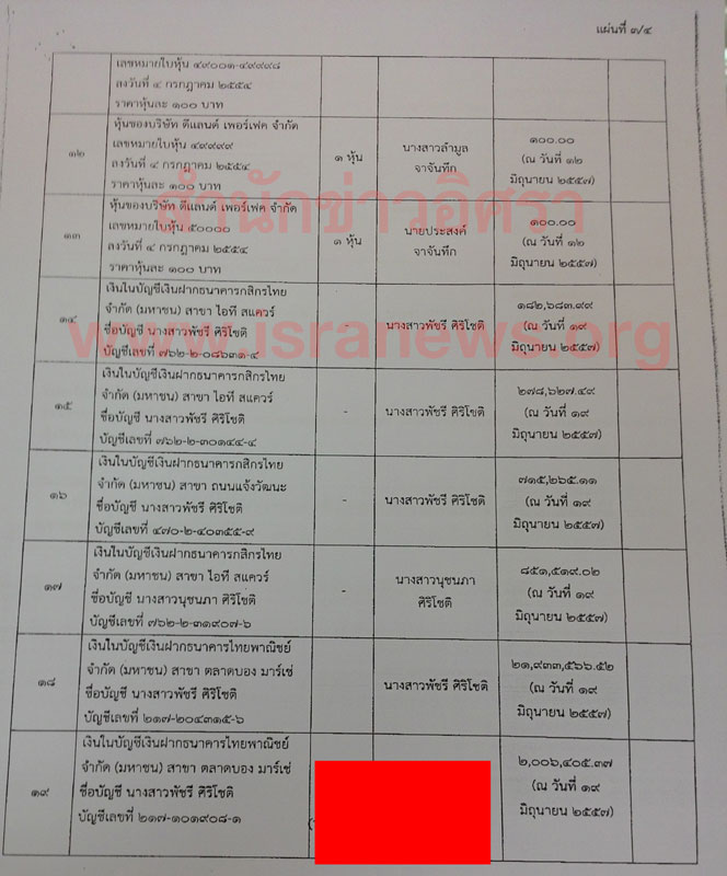 ลำดับที่ 14-16,18 -22 เงินในบัญชีเงินฝากธนาคารของ น.ส.พัชรี ศิริโชติ และลำดับที่ 17 เงินในบัญชีเงินฝากธนาคารของ น.ส.นุชนภา ศิริโชติ (ดูเอกสารประกอบ)