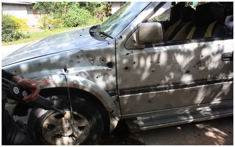 บรรยายภาพ : สภาพรถกระบะของทหารพรานที่ถูกคนร้ายลอบวางระเบิดจนพังเสียหาย ที่ อ.บันนังสตา จ.ยะลา (ภาพโดย อะหมัด รามันห์สิริวงศ์)