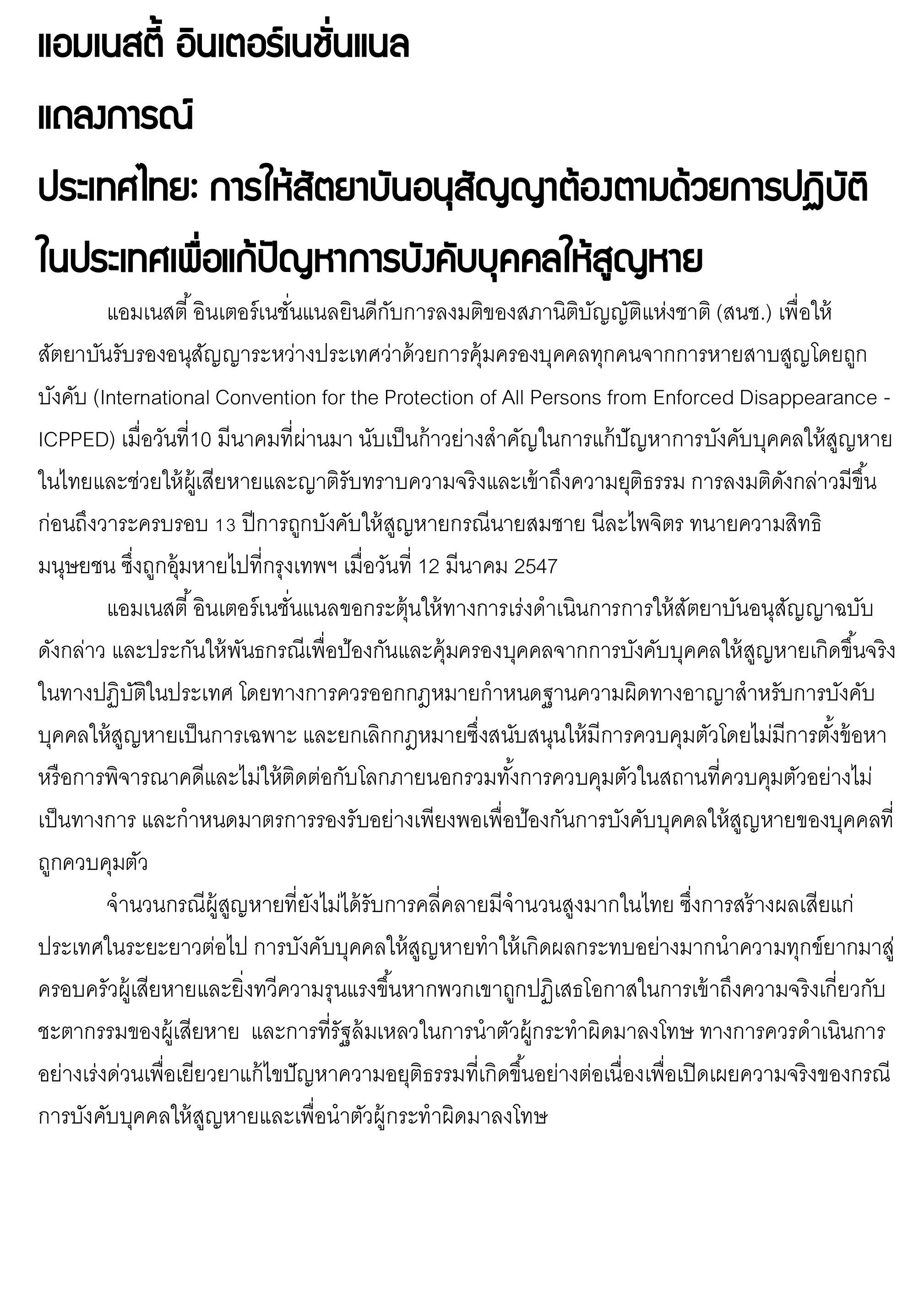 แอมเนสตี้ อินเตอร์เนชั่นแนลแถลงยินดีกับการลงมติของสภานิติบัญญัติแห่งชาติ (สนช.) เพื่อให้สัตยาบันรับรองอนุสัญญาระหว่างประเทศว่าด้วยการคุ้มครองบุคคลทุกคนจากการหายสาบสูญโดยถูกบังคับ (ICPPED) ซึ่งถือเป็นก้าวสำคัญในการแก้ปัญหาการอุ้มหาย ตลอดจนช่วยให้ผู้เสียหายและญาติเข้าถึงความยุติธรรมมากขึ้น
