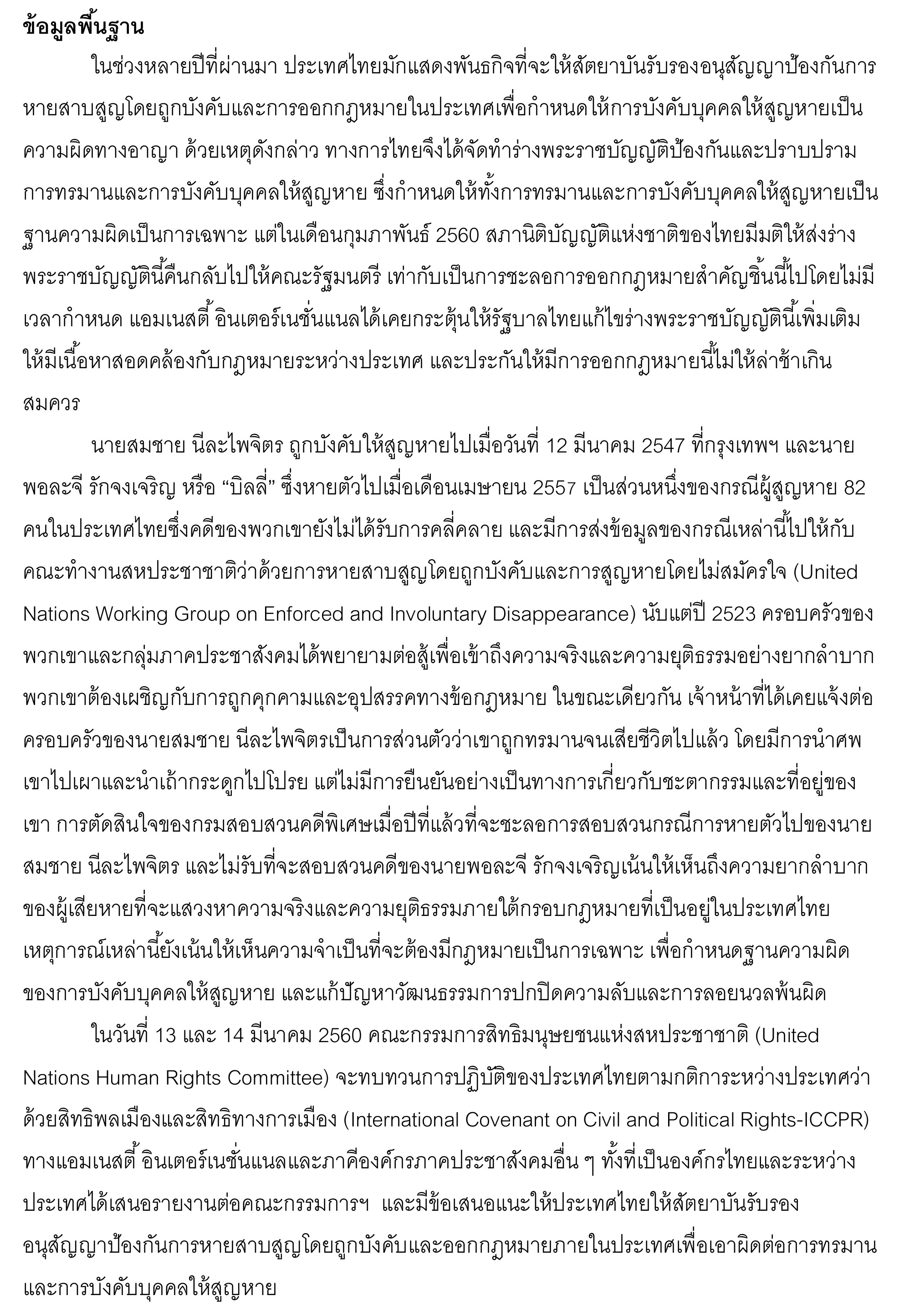 จำนวนกรณีผู้สูญหายที่ยังไม่ได้รับการคลี่คลายในไทยมีจำนวนสูงมาก ทางการจึงควรออกกฎหมายเอาผิดการอุ้มหายโดยเฉพาะ ยกเลิกกฎหมายซึ่งเปิดช่องให้มีการควบคุมตัวประชาชนโดยไม่มีการตั้งข้อหาหรือพิจารณาคดี ไปจนถึงกำหนดมาตรการเพื่อป้องกันการสูญหายของผู้ที่ถูกเจ้าหน้าที่รัฐควบคุมตัวด้วย