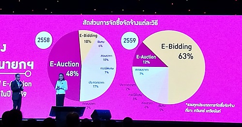 ดร. เดือนเด่น ถึงงบจัดซื้อจัดจ้างเฉลี่ยปี 2558-2559 อยู่ที่ 9 แสนล้านบาท แค่ข้อมูลปี 2559 ก็ชี้ชัดว่า เมื่อนำระบบ E-bidding มาใช้ในการจัดซื้อจัดจ้างภาครัฐ เราจะเห็นความแตกต่างระหว่างราคาจัดซื้อจัดจ้าง กับราคากลางแตกต่างกันมากกว่าประมูลด้วยระบบ E-auction อย่างชัดเจน