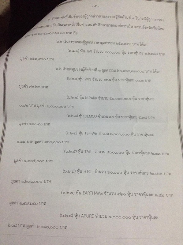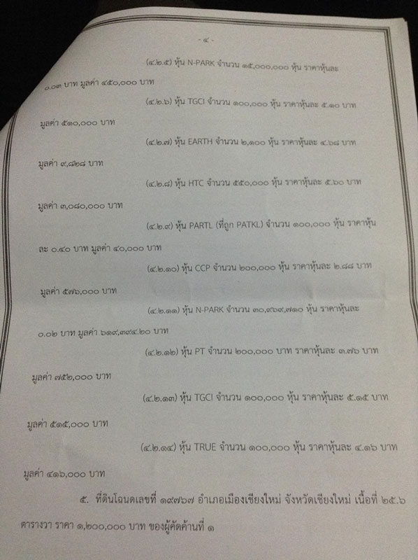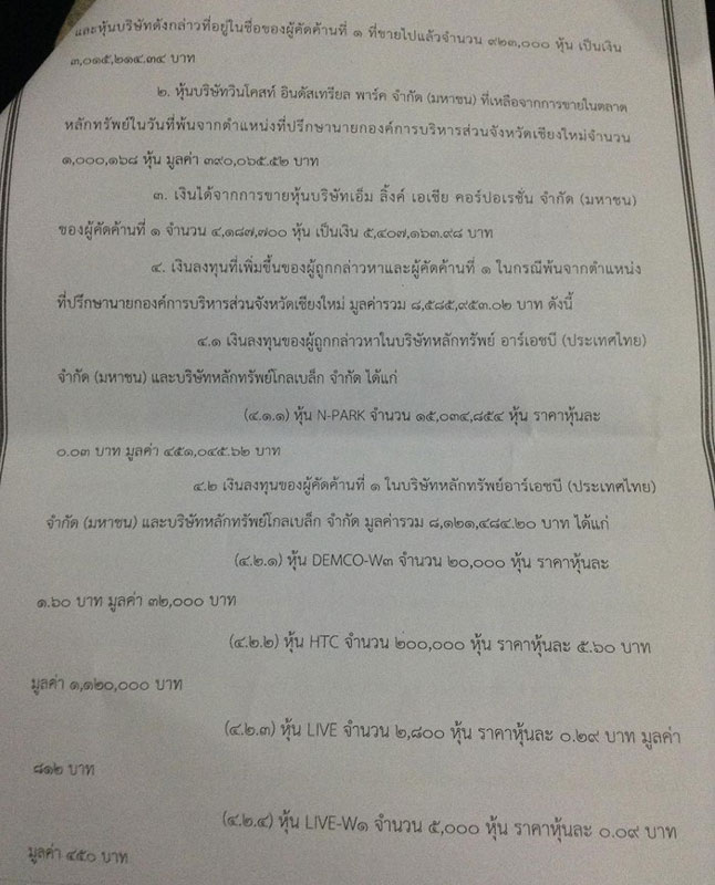 “…ที่นางบุญทอง อ้างว่า นำเงินจากการทำธุรกิจของ หจก.แม่ปิงฯ พร้อมกับเงินที่ได้จากโรงงานน้ำแข็ง โรงสี และเงินจากการทำธุรกิจขายทอง รวมวงเงินกว่า 100 ล้านบาท ไม่สมเหตุสมผล และไม่น่าเชื่อถือ เพราะจากการตรวจสอบผลประกอบการ หจก.แม่ปิงฯ ระหว่างปี 2551-2554 พบว่า ขาดทุนอย่างมาก ไม่น่าจะมีเงินมาให้นางดวงสุดากู้ยืมได้ นอกจากนี้การเก็บเงินสดไว้ในบ้านเป็นเงินกว่า 100 ล้านบาทนั้น ไม่น่าเป็นไปได้ เพราะทำให้เกิดอันตราย และไม่เกิดประโยชน์ รวมถึงไม่สร้างดอกเบี้ยแต่อย่างใด ดังนั้นการกล่าวอ้างดังกล่าวจึงไม่น่าเชื่อถือ เป็นการปกปิดทรัพย์สิน…”