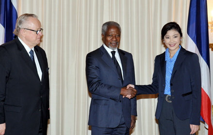 นายโคฟี่ อันนัน อดีตเลขาธิการสหประชาชาติและนายมาร์ตติ อาห์ติซาริ อดีต ปธน. ฟินแลนด์ได้เดินทางมาเยือนไทยตามคำเชิญของคณะกรรมการอิสระตรวจสอบและค้นหาความจริงเพื่อการปรองดองแห่งชาติ (คอป.) ระหว่างวันที่ 16-19 ก.พ. 2555 เพื่อให้คำปรึกษาแก่ คอป. และผู้ที่เกี่ยวข้องในการส่งเสริมและสร้างความปรองดองให้เกิดขึ้นในประเทศไทย ซึ่งนายกรัฐมนตรีได้กล่าวต้อนรับและใช้โอกาสนี้แลกเปลี่ยนความคิดเห็นกับบุคคลทั้งสอง ซึ่งทั้งสองคนเป็นผู้ที่ได้รับการยอมรับและมีชื่อเสียงระดับโลกในการสร้างความปรองดองในหลายประเทศ