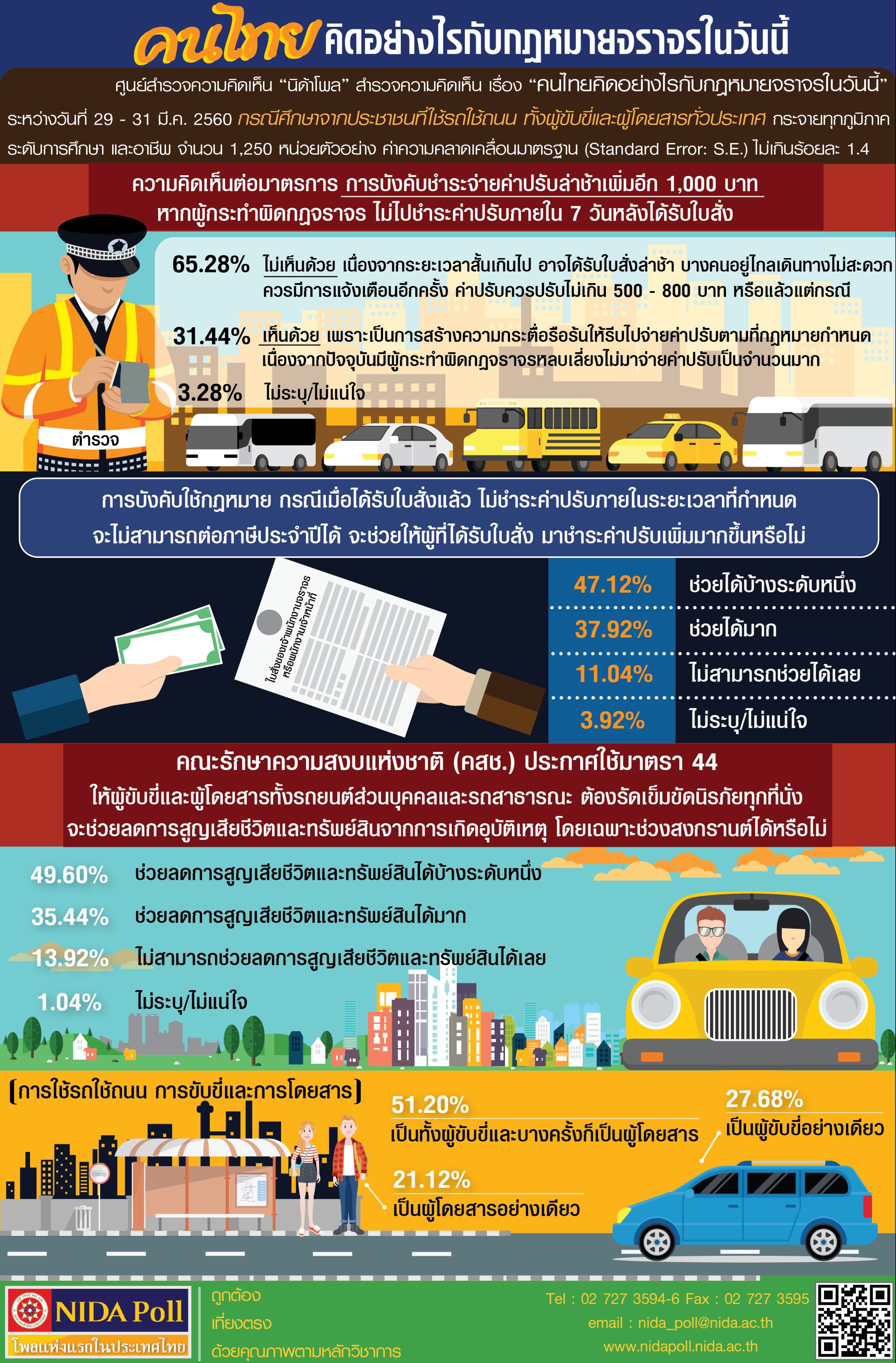 ศูนย์สำรวจความคิดเห็น “นิด้าโพล” สถาบันบัณฑิตพัฒนบริหารศาสตร์ (นิด้า) เปิดเผยผลสำรวจความคิดเห็นของประชาชน เรื่อง “คนไทยคิดอย่างไรกับกฎหมายจราจรในวันนี้” ทำการสำรวจระหว่างวันที่ 29 – 31 มีนาคม 2560 จากประชาชนที่ใช้รถใช้ถนน โดยเป็น ทั้งผู้ขับขี่และผู้โดยสารทั่วประเทศ กระจายทุกภูมิภาค ระดับการศึกษา และอาชีพทั่วประเทศ รวมทั้งสิ้น จำนวน 1,250 หน่วยตัวอย่าง เกี่ยวกับกฎหมายจราจร การสำรวจอาศัยการสุ่มตัวอย่างด้วยความน่าจะเป็น จากบัญชีรายชื่อฐานข้อมูลตัวอย่างหลัก (Master Sample) ของ “นิด้าโพล” ด้วยวิธีแบบแบ่งชั้นภูมิ (Stratified Random Sampling) โดยแบ่งชั้นภูมิตามภูมิภาค จากนั้นในแต่ละภูมิภาคสุ่มตัวอย่างด้วยวิธีแบบอย่างง่าย (Simple Random Sampling) เก็บข้อมูลด้วยวิธีการสัมภาษณ์ทางโทรศัพท์ โดยกำหนดค่าความเชื่อมั่นที่ ร้อยละ 95.0 และมีค่าความคลาดเคลื่อนมาตรฐาน (Standard Error: S.E.) ไม่เกิน 1.4