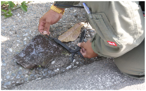บรรยายภาพ : เจ้าหน้าที่กำลังเก็บหลักฐานเศษซากวัตถุระเบิดหลังเกิดเหตุบึ้มดักสังหารทหารชุดลาดตระเวนในท้องที่ อ.ยะหา จ.ยะลา เมื่อวันศุกร์ที่ 17 ก.พ.ที่ผ่านมา (ภาพโดย อะหมัด รามันห์สิริวงศ์)
