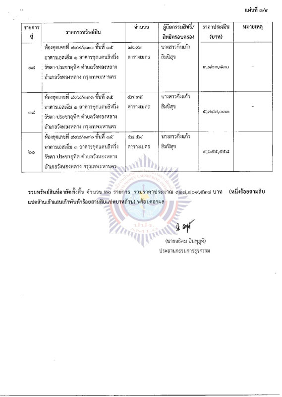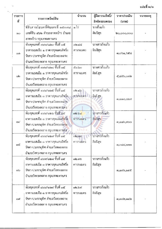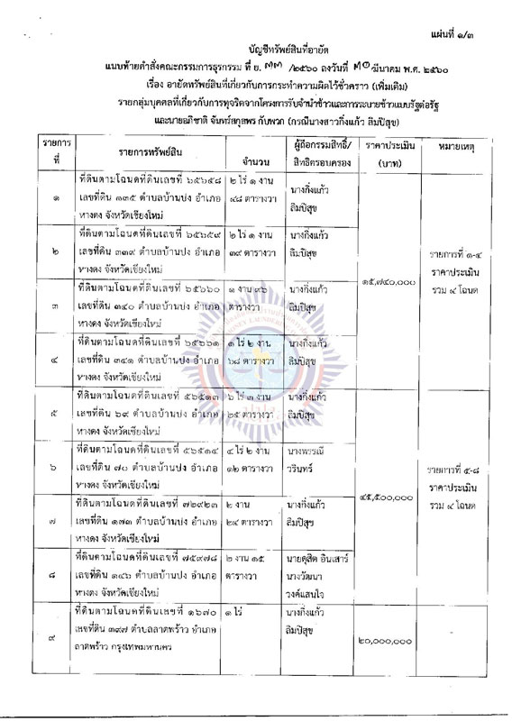 สำหรับทรัพย์สินที่ถูกอายัด ได้แก่ ที่ดิน จ.เชียงใหม่ 8 แปลง วงเงิน 61,240,000 บาท ที่ดิน จ.กรุงเทพฯ 2 แปลง 40 ล้านบาท ทีเหลือเป็นห้องชุดคอนโดมีเนียมอาคารเอสเอ็ม 1 อาคารชุดแดนลิฟวิ่ง รัชดา-ประชาอุทิศ แขวงวังทองหลาง เขตลาดพร้าว กทม. รวม 10 ห้อง (ดูเอกสารประกอบ)