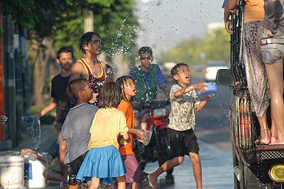 ในขณะเดียวกัน การเตรียมพื้นที่เล่นปลอดภัยในบริเวณชุมชนให้กับเด็ก เป็นหน้าที่ที่สำคัญของผู้บริหาร ท้องถิ่น ผู้นำชุมชน ในการเตรียมพื้นที่ให้เล่นน้ำเฉพาะ เพื่อลดอุบัติเหตุจราจร และต้องเป็นพื้นที่ให้ความปลอดภัยสำหรับเด็ก เน้นป้องกันการจมน้ำ การถูกรถชน ของหนักหล่นทับ ตกที่สูง ถูกไฟฟ้าดูด ระวังเฝ้าดู ความรุนแรง (การกระทำต่อเด็ก) ที่สำคัญควร "งดเหล้า" และเครื่องดื่มแอลกอฮอล์ ไม่ขายอุปกรณ์ฉีดน้ำที่ไม่ เหมาะสมในเขตพื้นที่เล่นน้ำเฉพาะ