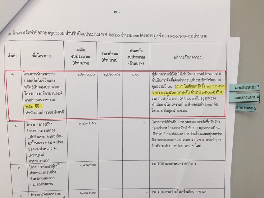 แต่มีข้อสังเกตว่า โครงการจัดซื้อฯ ปีงบประมาณ 2560 ของสำนักงานตำรวจแห่งชาติ ที่ต้องเข้าร่วมข้อตกลงคุณธรรม คือ การจัดซื้อรถจักรยานยนต์สายตรวจขนาด 250 ซีซี. จำนวน 15,015 คัน วงเงินงบประมาณ 2,230 ล้านบาท แต่หน่วยงานได้ลงนามสั่งซื้อไปแล้วเมื่อ 14/12/59 ก่อนมีการใช้ข้อตกลงคุณธรรม โดยจัดซื้อในวงเงิน 2,229.97 หรือต่ำกว่าราคากลาง 3 หมื่นบาท (ข้อมูลกรมบัญชีกลาง)