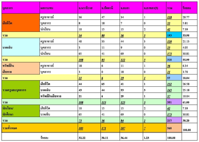 ฉะนั้นตลอด 8 ปีเศษ มีครูอาจารย์ บุคลากรทางการศึกษา และนักเรียนนักศึกษาที่ได้รับผลกระทบจากสถานการณ์ความไม่สงบทุกกรณีทั้งสิ้น 568 ราย