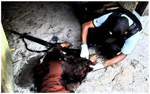บรรยายภาพ : เจ้าหน้าที่ตำรวจกำลังชันสูตรพลิกศพผู้เสียชีวิตจากเหตุการณ์คนร้ายบุกโจมตีจุดตรวจร่วม ชรบ.-ทหารพราน ที่ อ.ปะนาเระ จ.ปัตตานี
