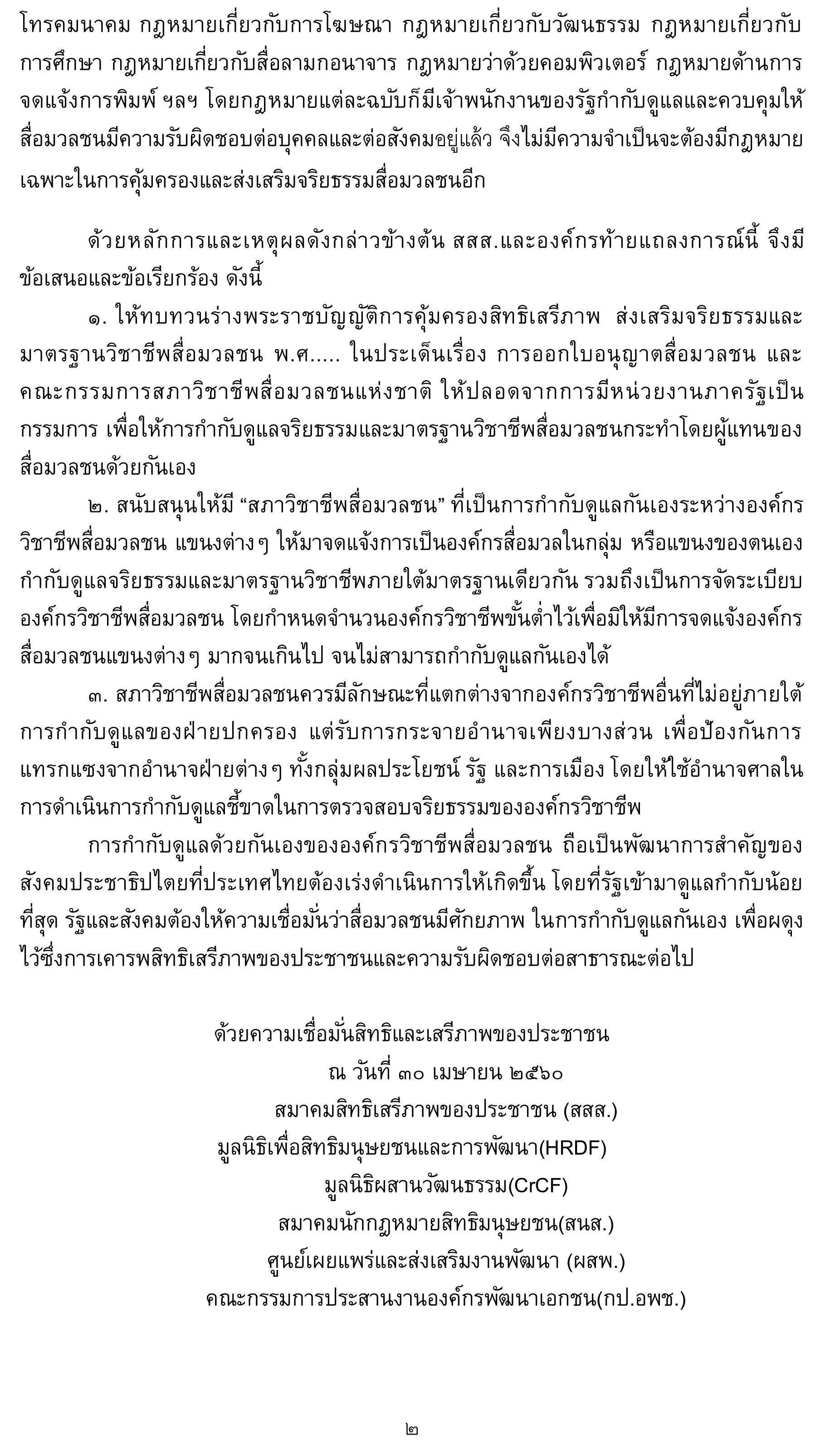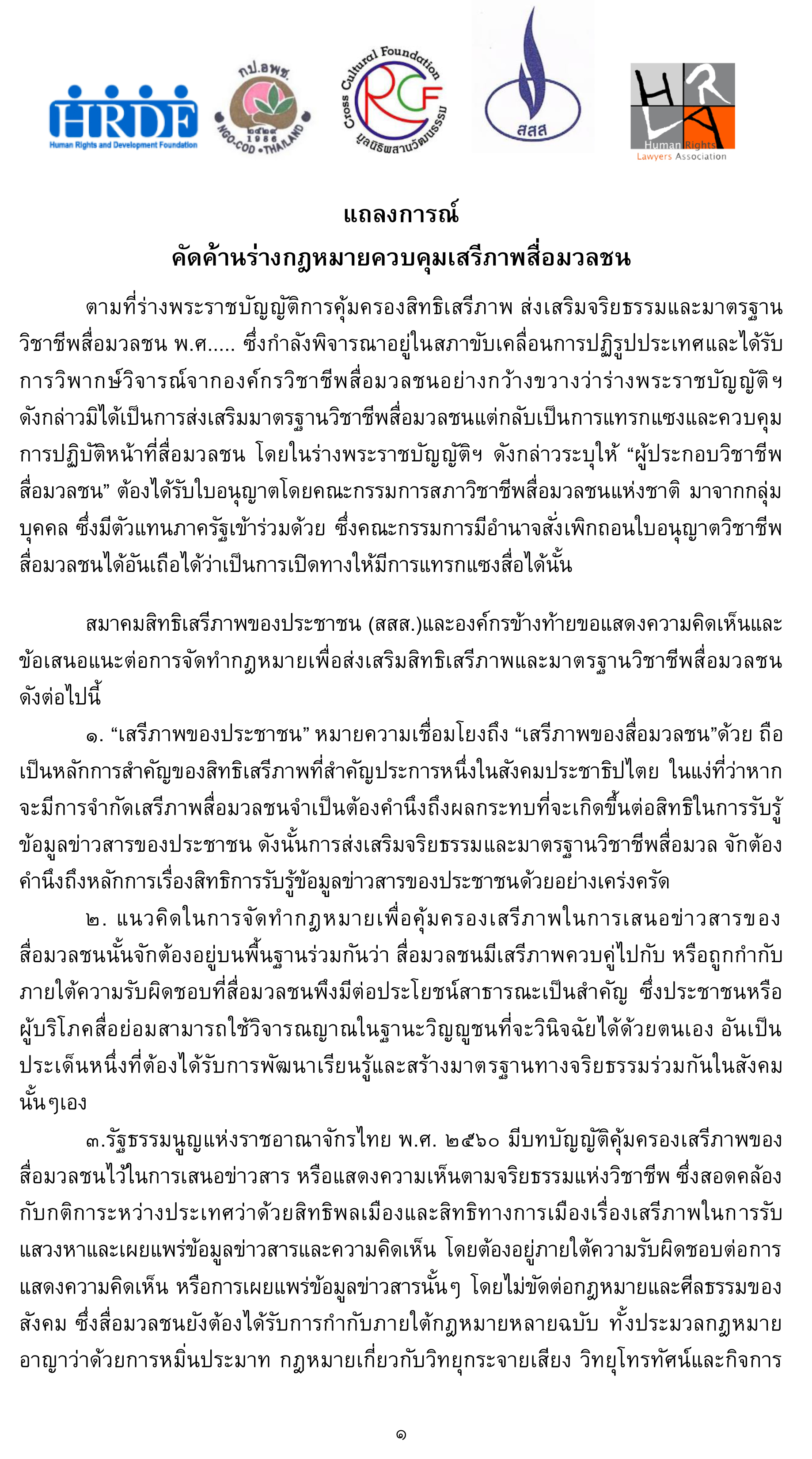 สมาคมสิทธิเสรีภาพของประชาชน (สสส.) และองค์กรข้างท้ายขอแสดงความคิดเห็นและข้อเสนอแนะต่อการจัดทากฎหมายเพื่อส่งเสริมสิทธิเสรีภาพและมาตรฐานวิชาชีพสื่อมวลชน ดังต่อไปนี้