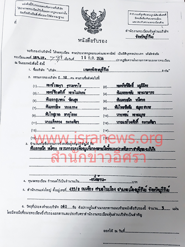 สำหรับ บริษัท เกษตรอิสระบุรีรัมย์ จำกัด จากการตรวจสอบหนังสือบริคณห์สนธิพบชื่อผู้ก่อการจดทะเบียน 7 คน