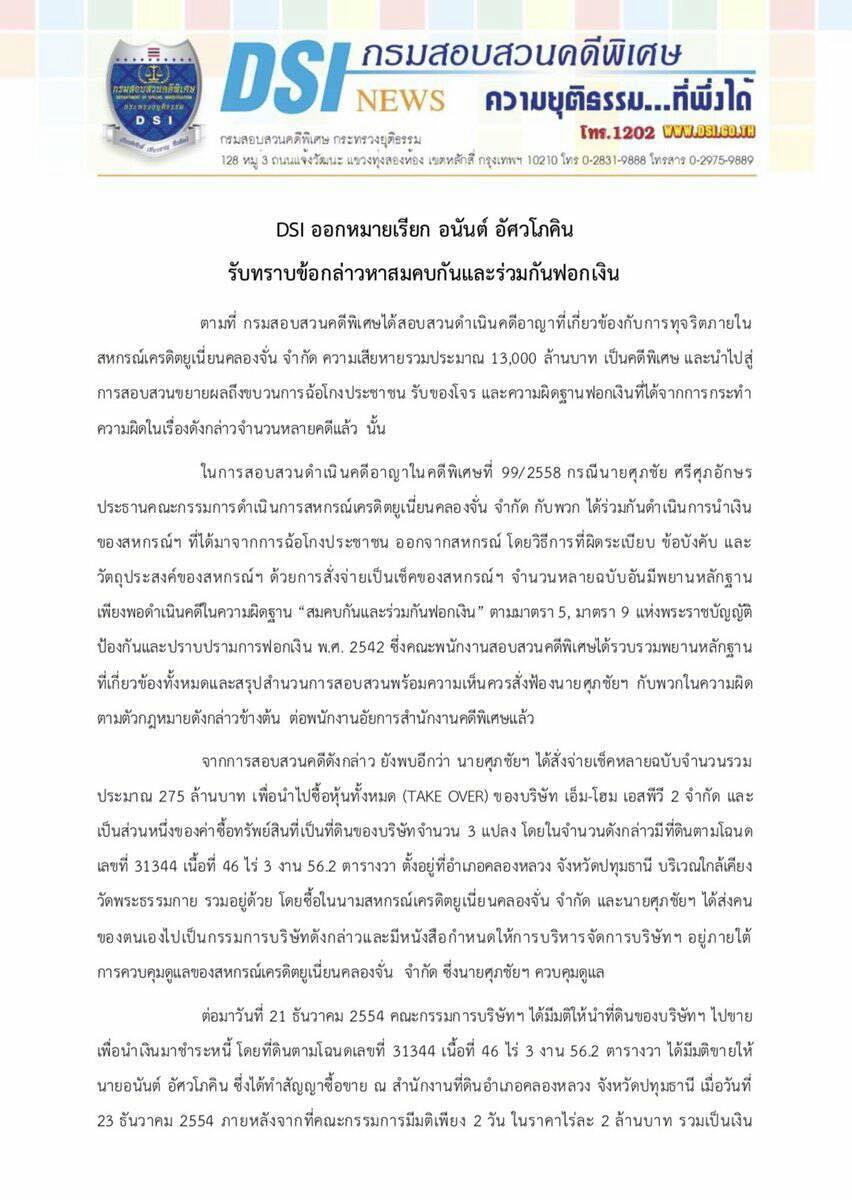 กรมสอบสวนคดีพิเศษ ออกหมายเรียก อนันต์ อัศวโภคิน รับทราบข้อกล่าวหาสมคบกันและร่วมกันฟอกเงิน ยันมีพยานหลักฐาน โยงสหกรณ์เครดิตยูเนี่ยนคลองจั่น