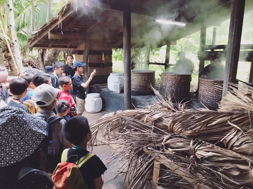 เด็กและผู้ปกครองได้เห็นการใช้ประโยชน์จากมะพร้าวอย่างครบวงจร ได้เห็นการทำน้ำตาลตั้งแต่การ ตัดงวงมะพร้าว รองน้ำตาลลงในกระบอก กรองน้ำตาลสดที่ได้ ก่อนเทลงใส่ในกระทะตั้งบนเตาไฟ ด้วยวิธีการแบบดั้งเดิมเอกลักษณ์ภูมิปัญญาชาวอัมพวา