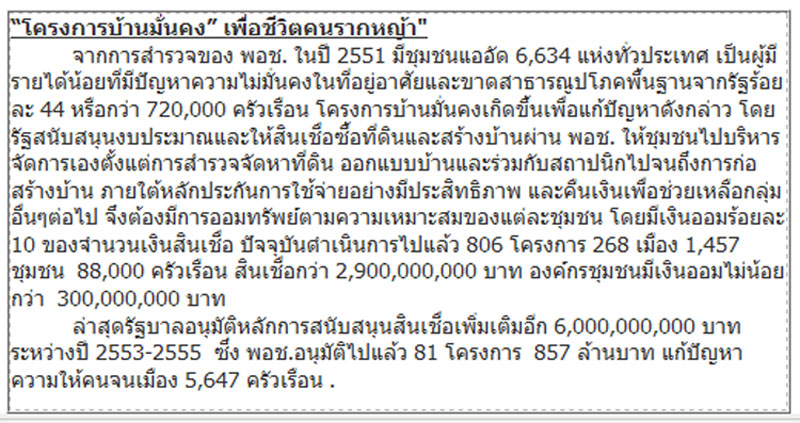 “จุดเด่นของบ้านมั่นคงคือมีลักษณะเป็นองค์กรที่มีกระบวนการทำงานร่วมกันอยู่แล้ว การจัดการสื่อสารจึงไม่ใช่เรื่องยาก แต่ที่สำคัญคือต้องเน้นการสื่อสารที่มีความสมบูรณ์และมีส่วนร่วมของชาวบ้าน แต่ต้องระวังอย่ามุ่งเป้าไปที่การประชาสัมพันธ์มากนัก”