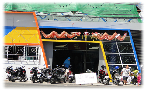 บรรยายภาพ : บรรยากาศหน้าห้างซุปเปอร์ดีพาร์ทเมนท์สโตร์กลางเมืองปัตตานีซึ่งเพิ่งถูกคนร้ายปาระเบิดเพลิงเผาคลังสินค้าด้านหลัง ปรากฏว่ายังคงมีประชาชนไปจับจ่ายซื้อของตามปกติ