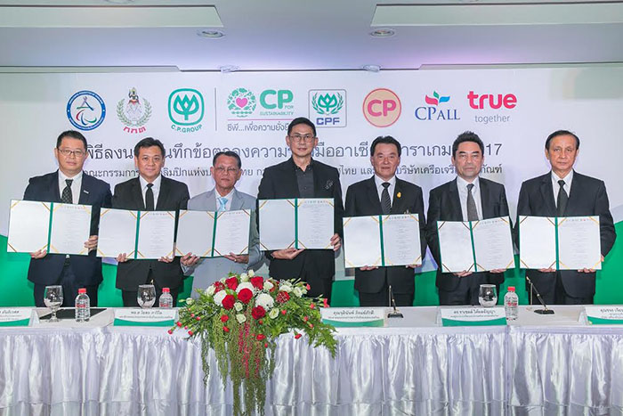 เมื่อวันที่ 22 มิ.ย. 2560 ณ ห้องออดิทอเรียม ชั้น 21 อาคารทรู ทาวเวอร์ คณะกรรมการพาราลิมปิกแห่งประเทศไทย และการกีฬาแห่งประเทศไทย พร้อมด้วย เครือเจริญโภคภัณฑ์ , บริษัท เจริญโภคภัณฑ์อาหาร จำกัด (มหาชน), บริษัท ซีพี ออลล์ จำกัด (มหาชน) และบริษัท ทรู คอร์ปอเรชั่น จำกัด (มหาชน) จัดพิธีลงนามบันทึกข้อตกลงความร่วมมือสนับสนุนอาหารและการสื่อสารให้แก่นักกีฬาไทยในอาเซียนพาราเกมส์ ครั้งที่ 9 ประจำปี 2017 ที่จะแข่งขันระหว่างวันที่ 17-23 ก.ย.นี้ ณ กรุงกัวลาลัมเปอร์ ประเทศมาเลเซีย