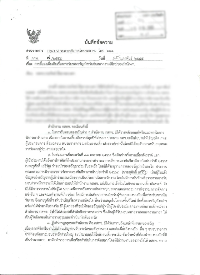 2.ของรางวัลดังกล่าวถูกผู้เข้าร่วมงานนำมามอบผ่านนายชูศักดิ์ เสรีรัฐ ประธานกรรมการพิจารณาการจัดการแข่งขันกีฬาสีภายในประจำปี ๒๕๕๕ เอกชนผู้ร่วมงานมิได้บอกรายละเอียดว่าเป็นของขวัญอะไร นายชูศักดิ์ก็ไม่ได้ทำบันทึกรับมอบล่วงหน้าเพราะของขวัญมิได้มอบให้สำนักงาน กสทช. จึงไม่ได้รายงานผู้ใด