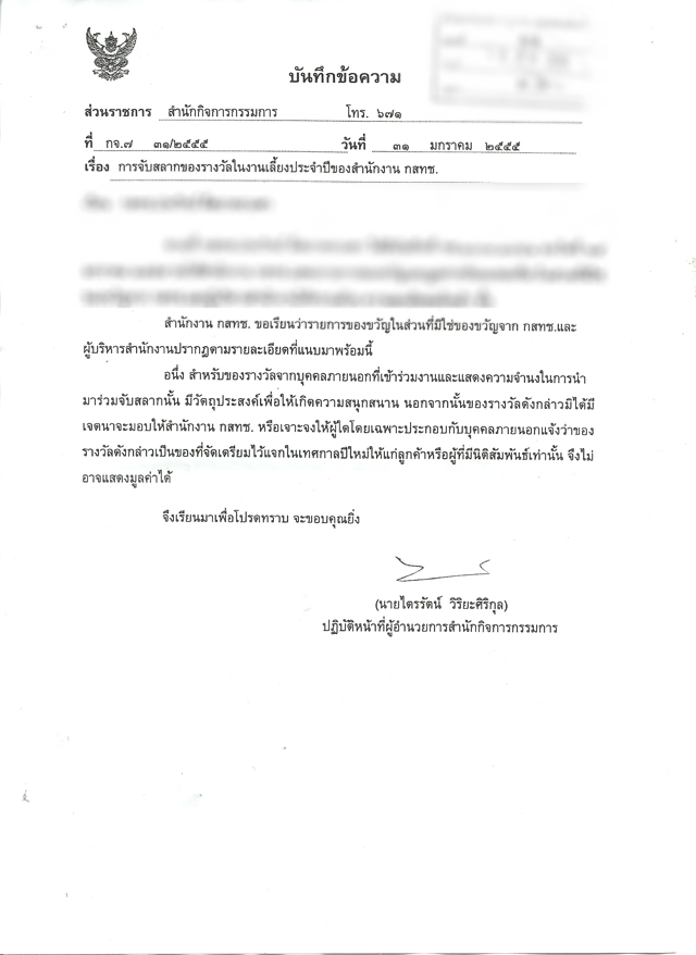 เอกสารฉบับแรก ที่ กจ.๗ ๓๑/๒๕๕๕ วันที่ ๓๑ มกราคม ๒๕๕๕ นายไตรรัตน์ วิริยะศิริกุล ปฏิบัติหน้าที่ผู้อำนวยการสำนักกิจการ