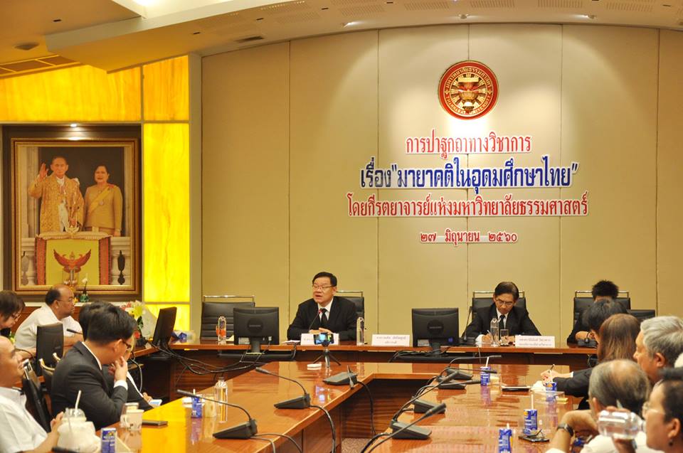 เนื่องในวันสถาปนามหาวิทยาลัยธรรมศาสตร์ (มธ.) ครบรอบ 83 ปี ศ.ดร.สุรพล นิติไกรพจน์ กีรตยาจารย์แห่งมหาวิทยาลัยธรรมศาสตร์ สาขาสังคมศาสตร์ ประจำปี 2559 และอดีตอธิการบดีมหาวิทยาลัยธรรมศาสตร์ (มธ.) กล่าวปาฐกถาในหัวข้อ “มายาคติในอุดมศึกษาไทย” ณ มหาวิทยาลัยธรรมศาสตร์ ท่าพระจันทร์