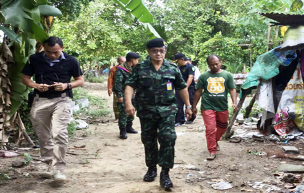 1 พล.ต.จตุพร กลัมพสุต ผู้บังคับหน่วยเฉพาะกิจปัตตานี เดินเท้าเข้าที่เกิดเหตุยิงปะทะที่ปะกาฮะรัง อ.เมืองปัตตานี